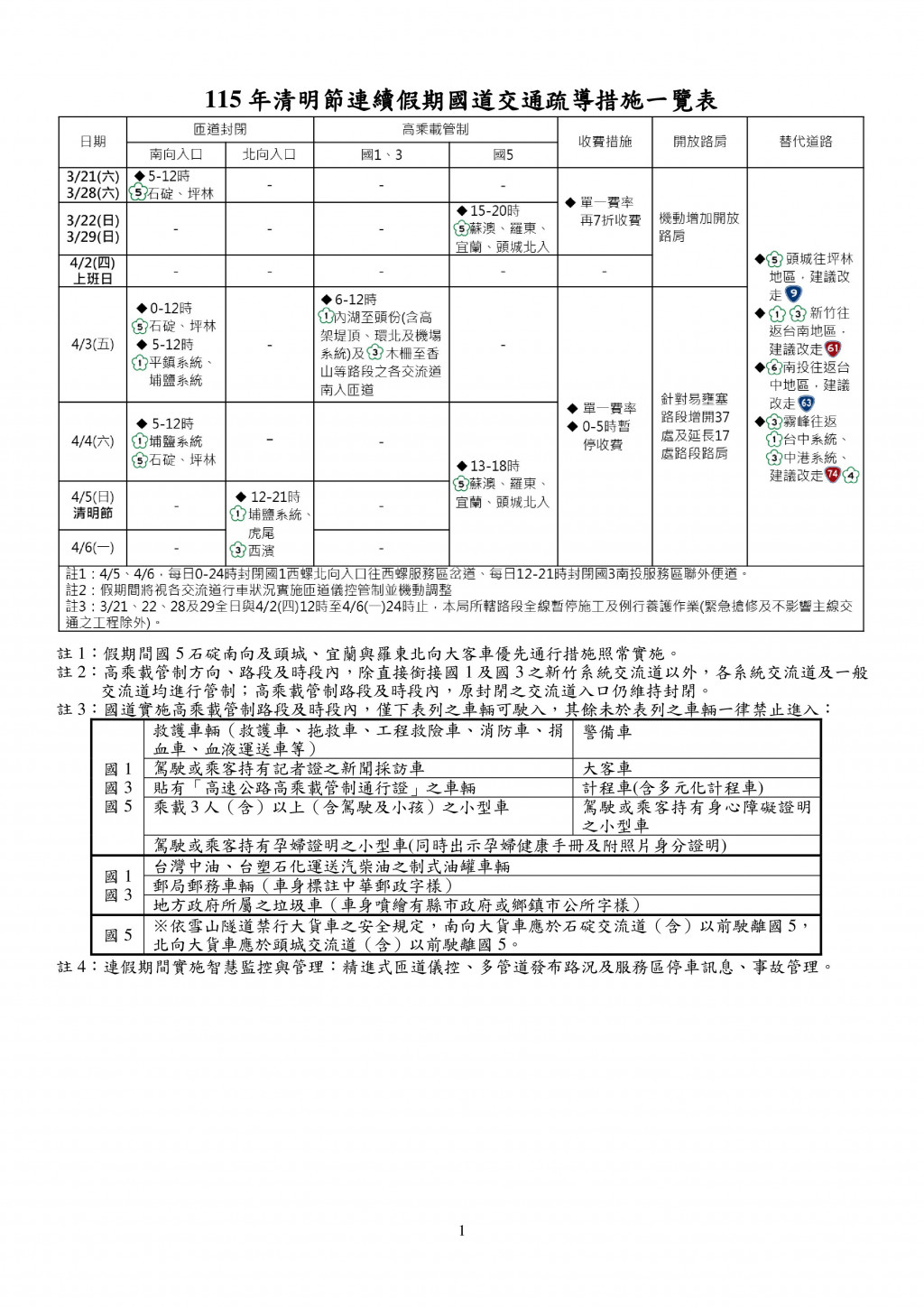115年清明節連續假期國道交通疏導措施一覽表