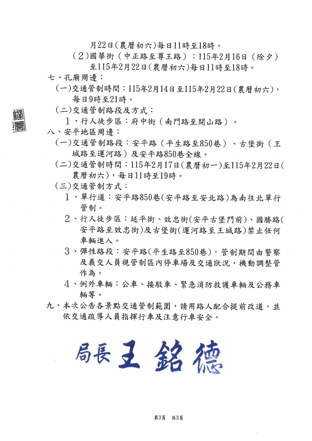 臺南市115年春節連續假期各風景區聯外道路交通管制公告